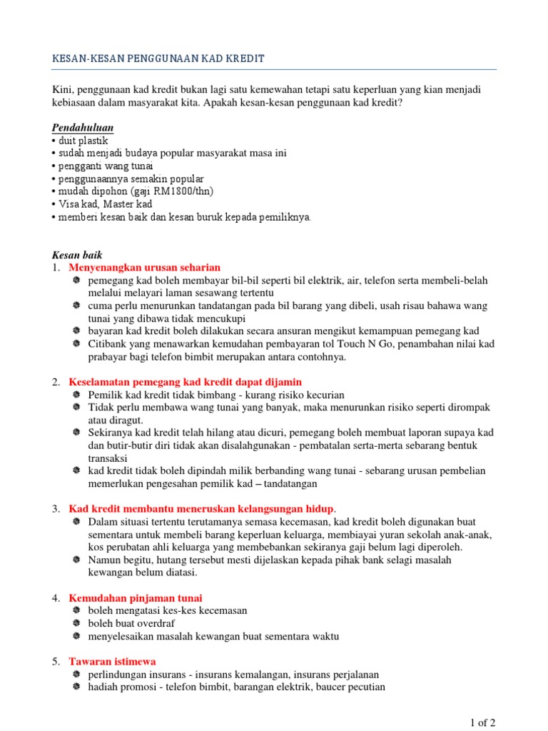 Esei Penggunaan Kad Kredit. Namun begitu sekiranya pemilik kad kredit menggunakan kemudahan tersebut secara bijak mereka akan mendapat faedah yang banyak. Sekiranya tiada disiplin maka akan timbullah masalah keberhutangan malah boleh menjadi serius.